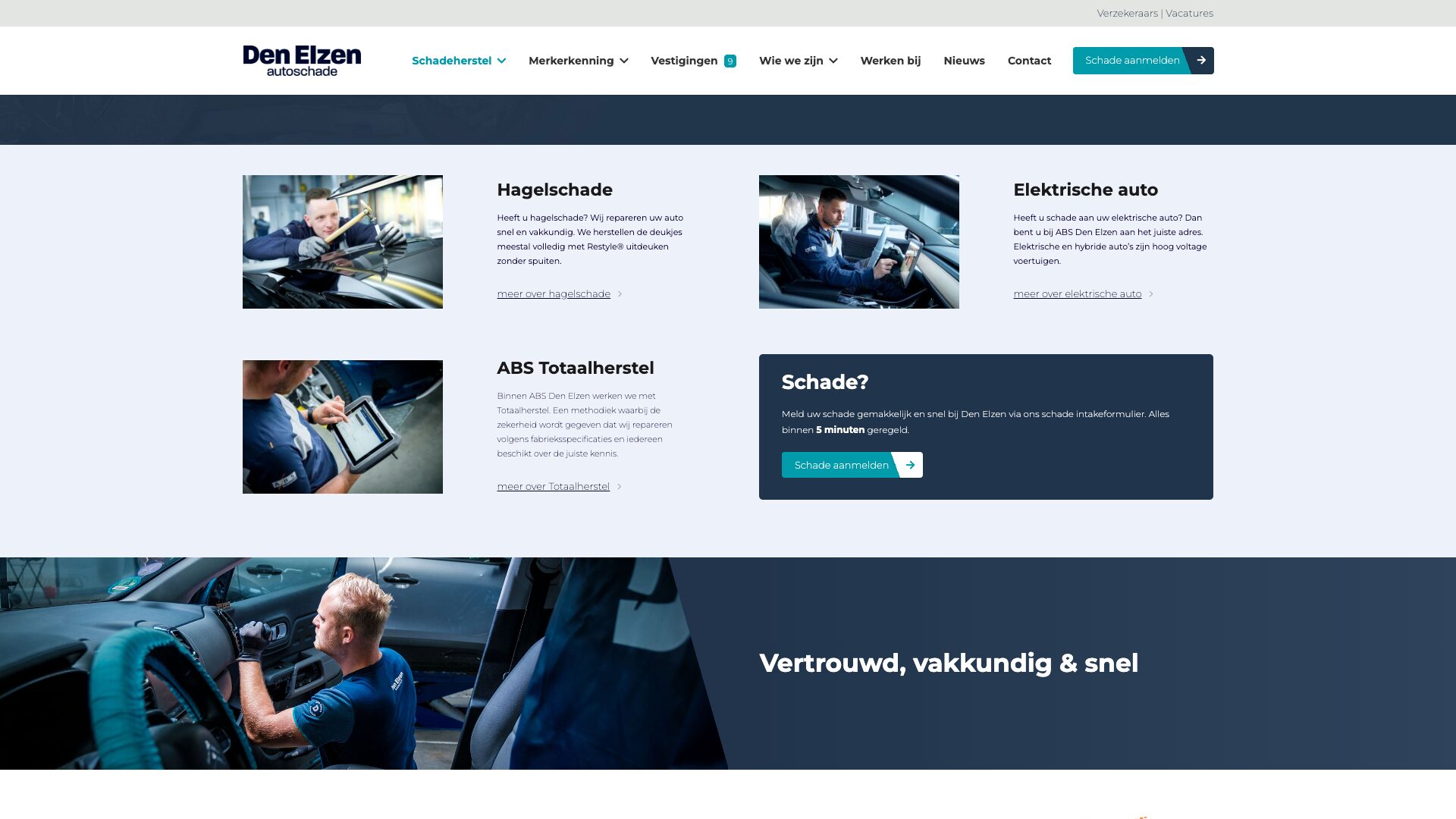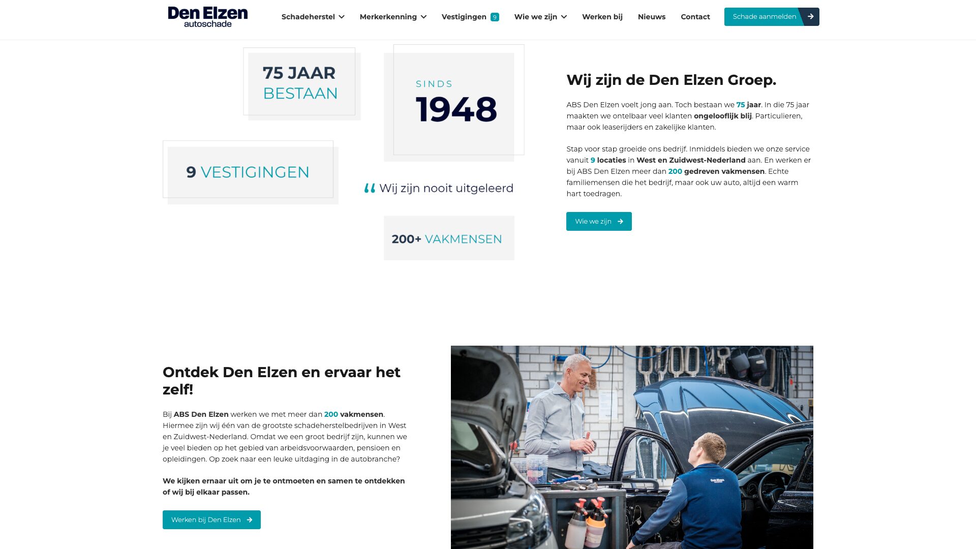 ABS Den Elzen is een schadeherstelbedrijf dat al 75 jaar actief is. Met negen vestigingen en ruim 200 medewerkers is het 1 van de grootste van Nederland. Den Elzen is een hecht familiebedrijf dat streeft om elke auto perfect te repareren.