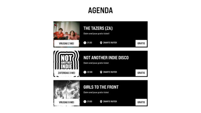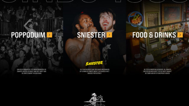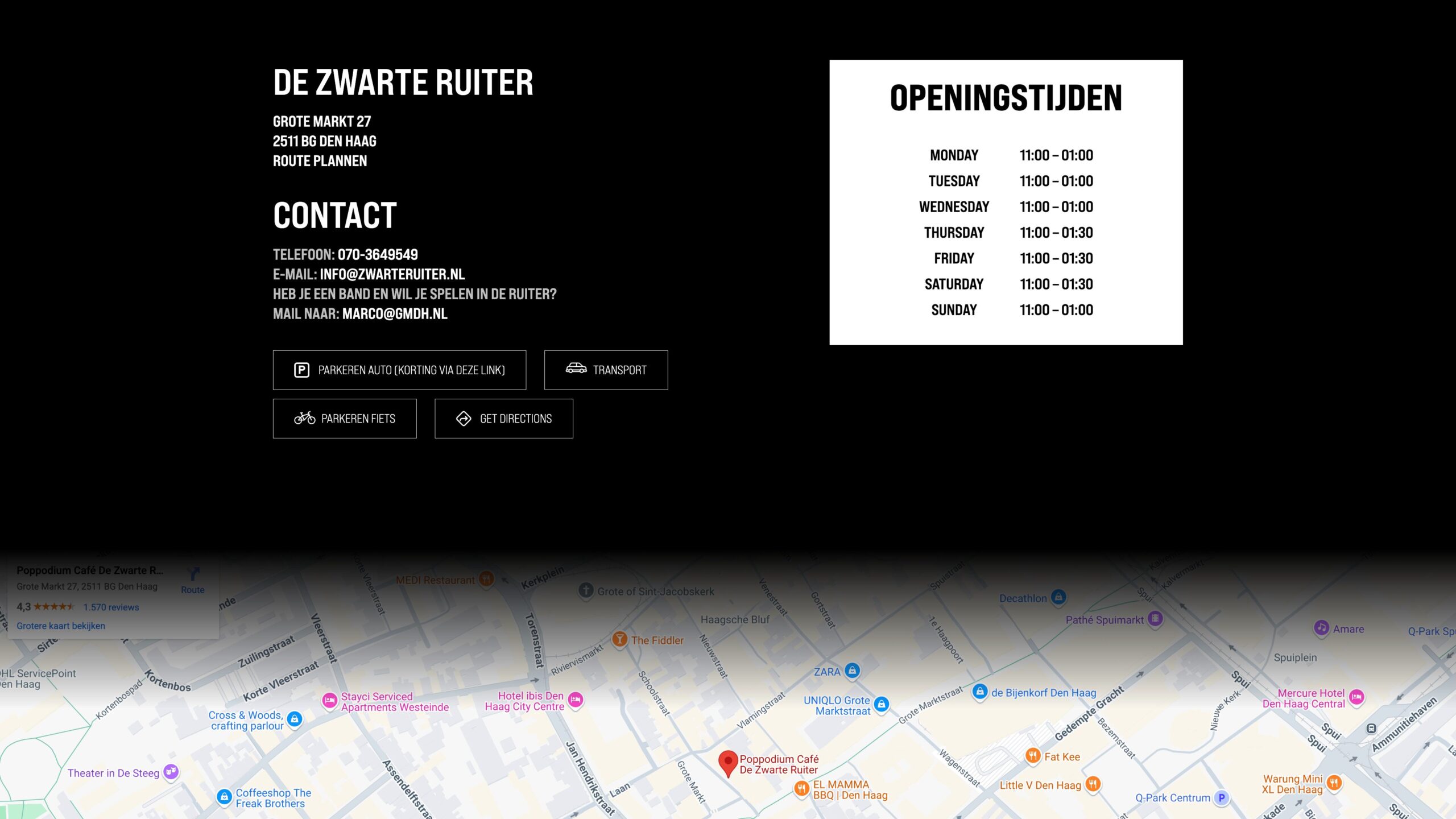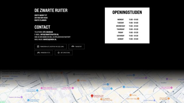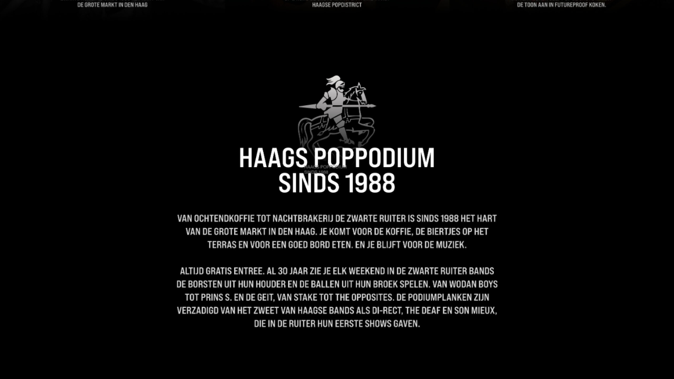 De Zwarte Ruiter is een kroeg en poppodium midden op de Grote Markt in Den Haag. Je kunt er eten, drinken en tot laat feesten met veel live muziek en een levendige sfeer. Veel grote Haagse artiesten zoals Di-Rect zijn hier ooit begonnen.