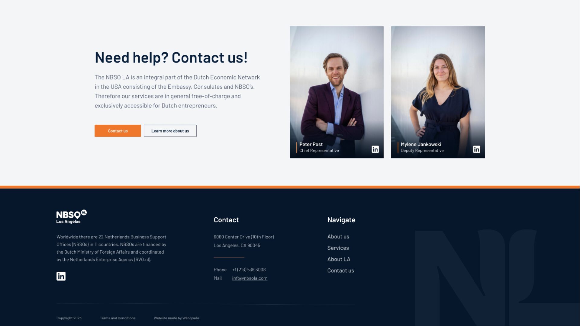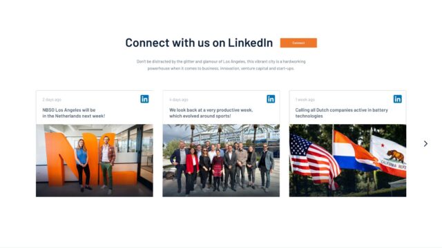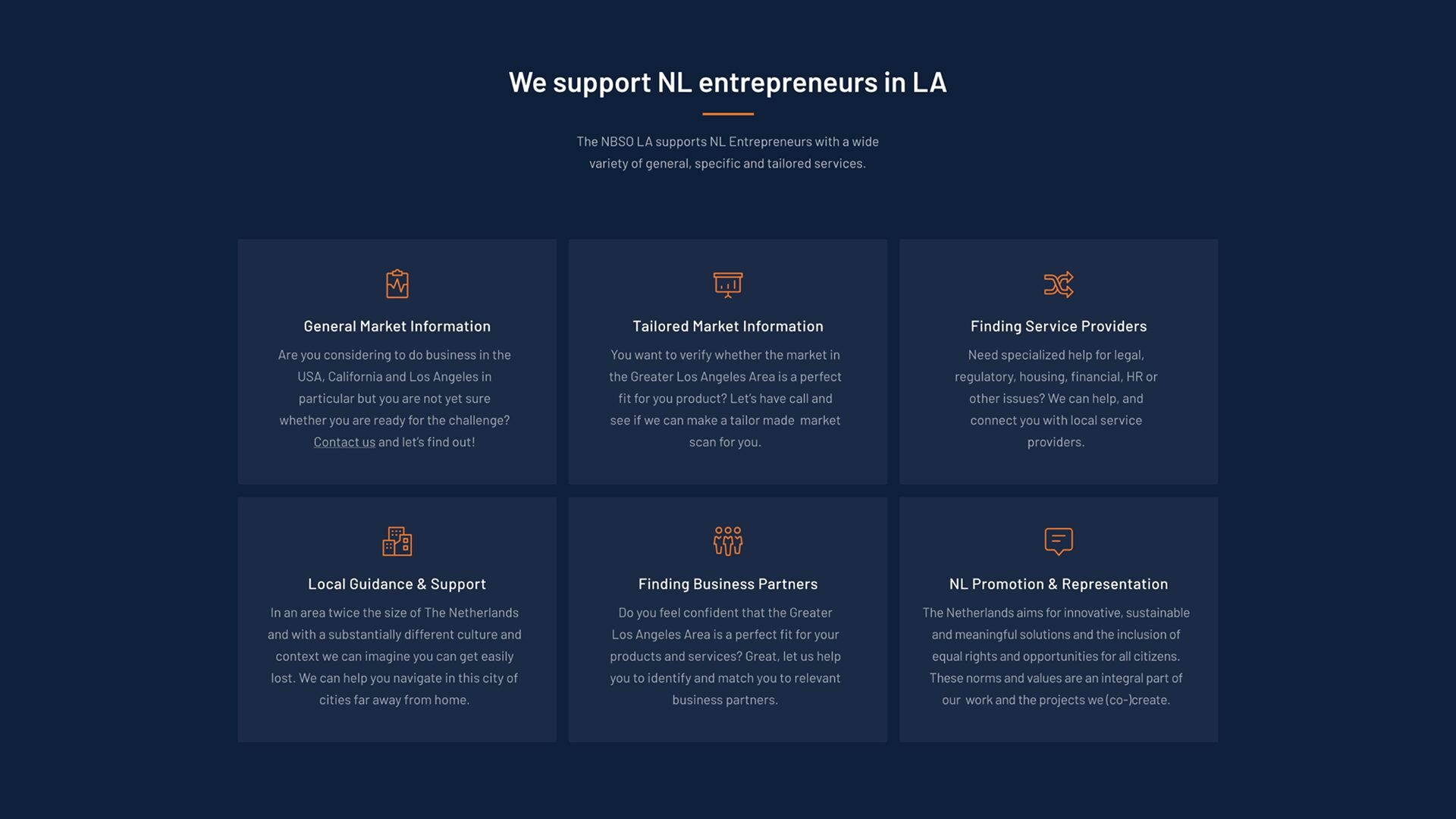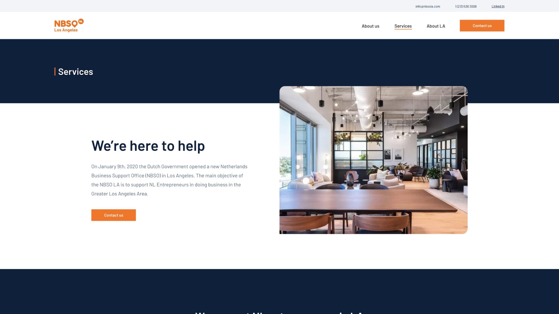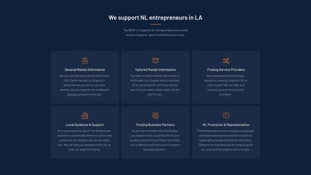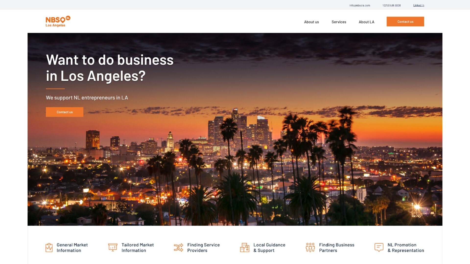 NBSO Los Angeles is een Nederlands Business Support Office. Het doel van de organisatie is om Nederlandse ondernemers te ondersteunen die gevestigd zijn in de ‘Greater Los Angeles Area’ Het bedrijf biedt haar diensten gratis aan en wordt gefinancierd vanuit de Nederlandse overheid.