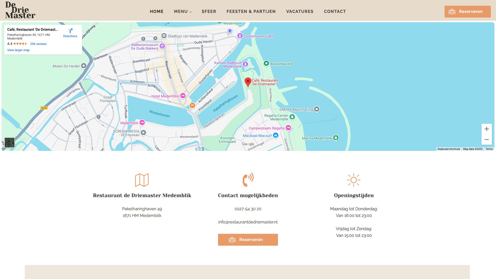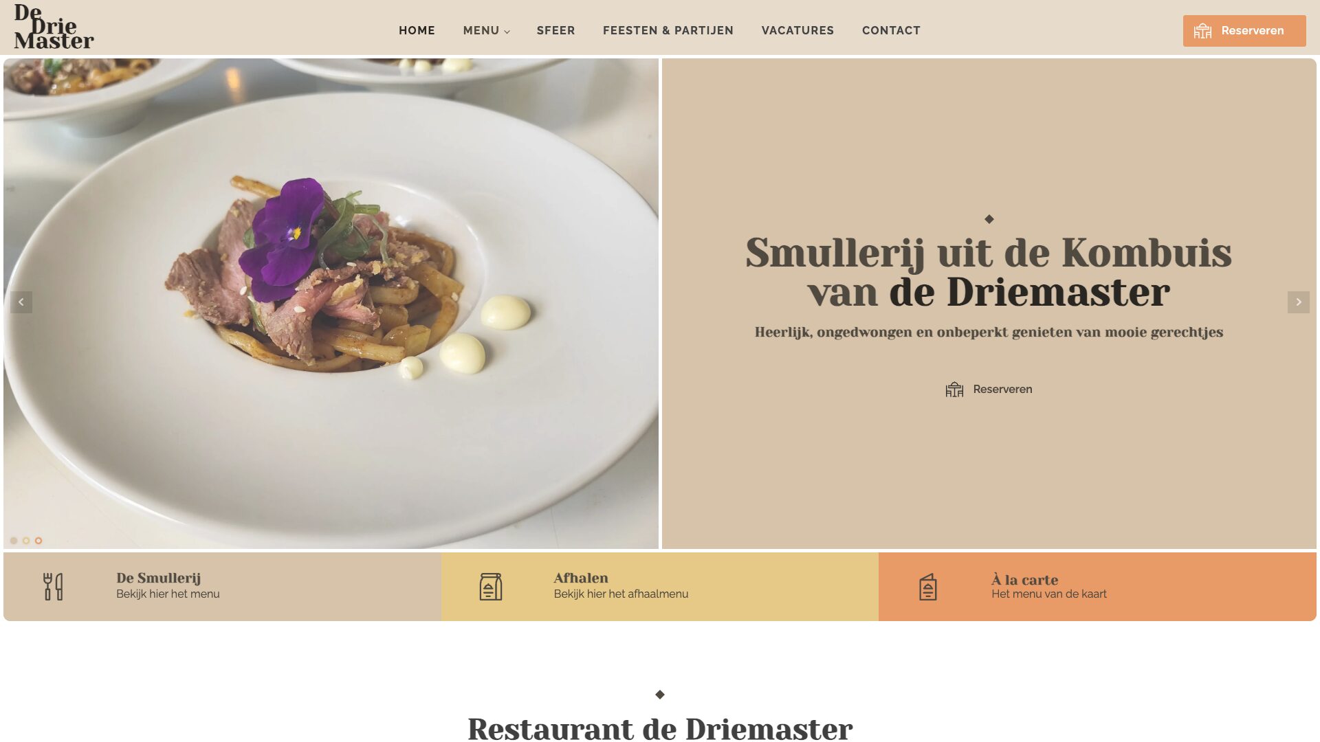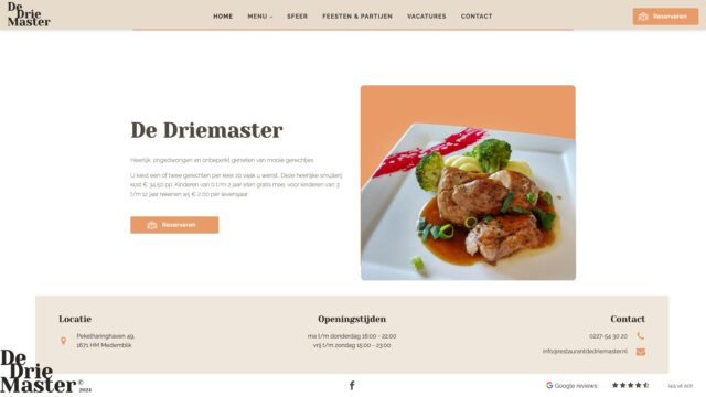 Restaurant de Driemaster bevindt zich midden in de havenstad Medemblik. Bij de Driemaster kan je genieten van een à la carte menu maar ook gerechten afhalen. Daarnaast is het de perfecte locatie voor evenementen zoals een verjaardag of barbecue.