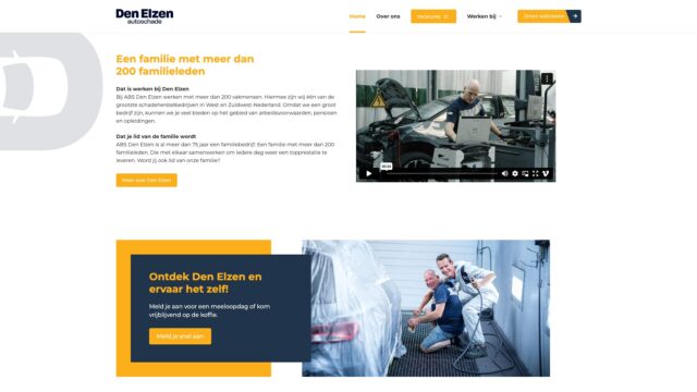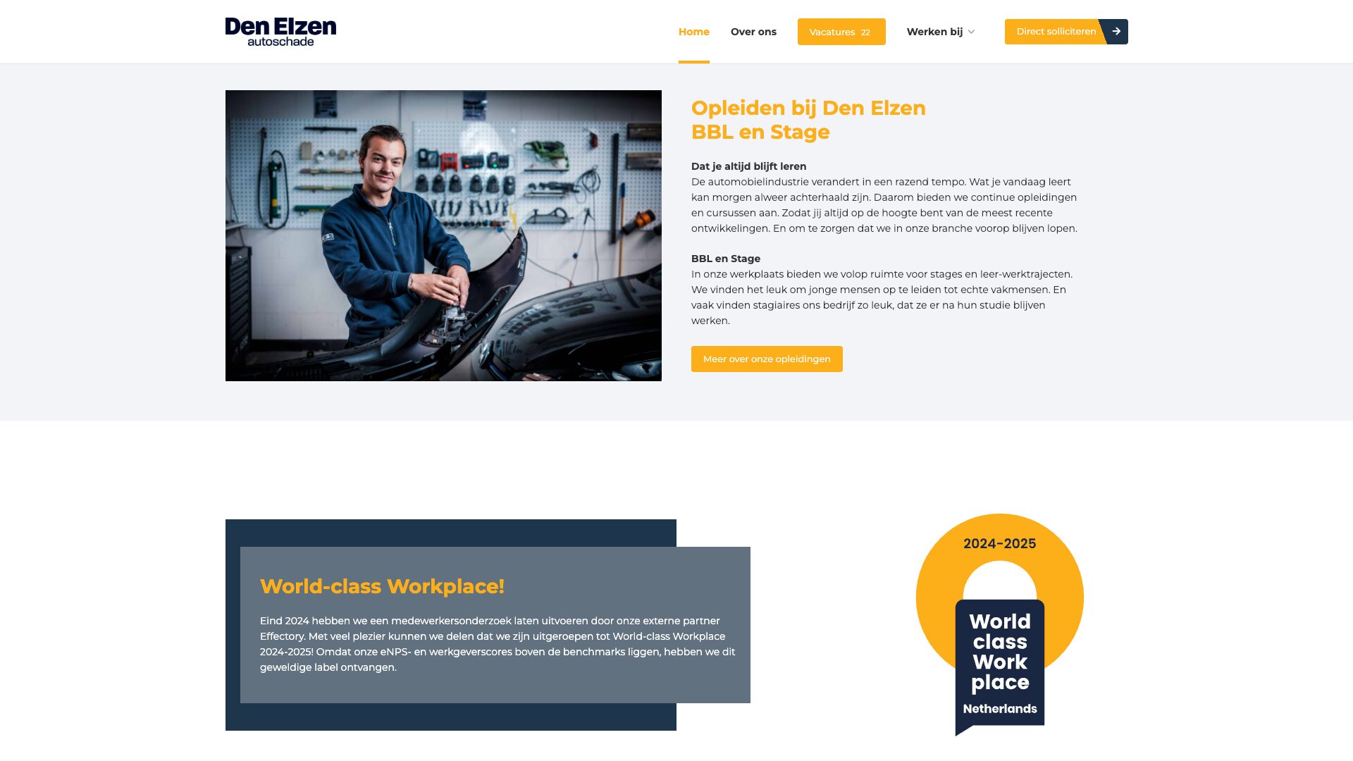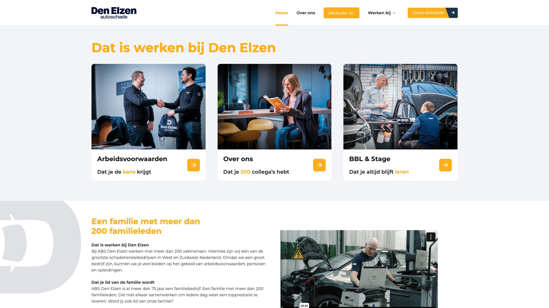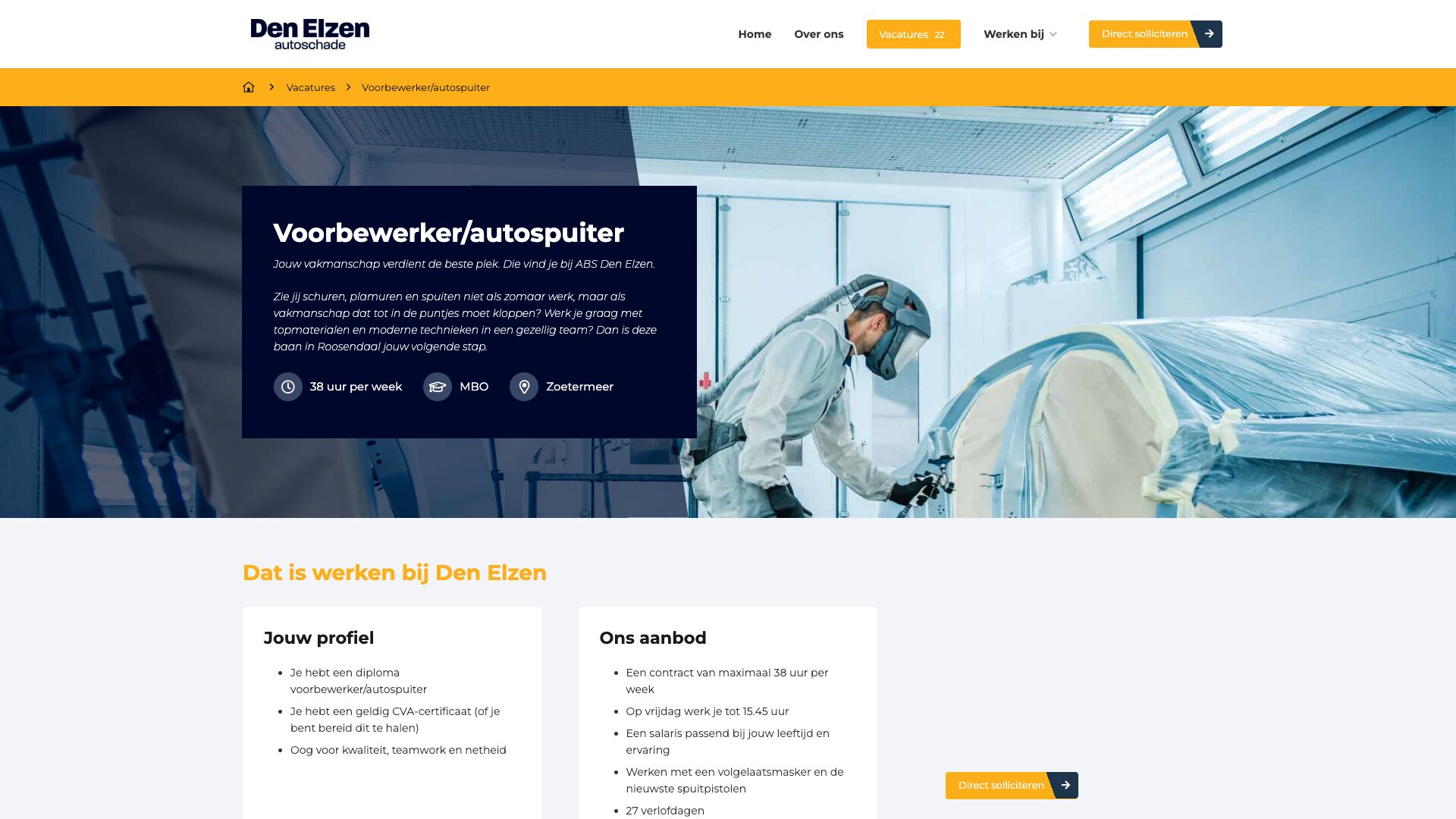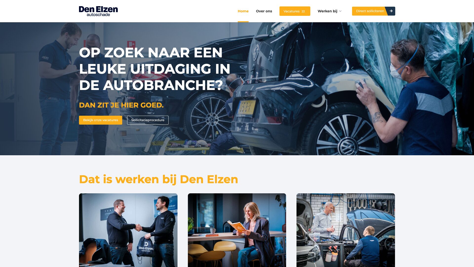 Den Elzen is een familiebedrijf gespecialiseerd in schadeherstel, met meer dan 200 vakmensen in dienst. Op de ‘Werken bij’ site van Den Elzen wordt alle informatie gegeven voor werkzoekenden, van arbeidsvoorwaarden tot vacatures.